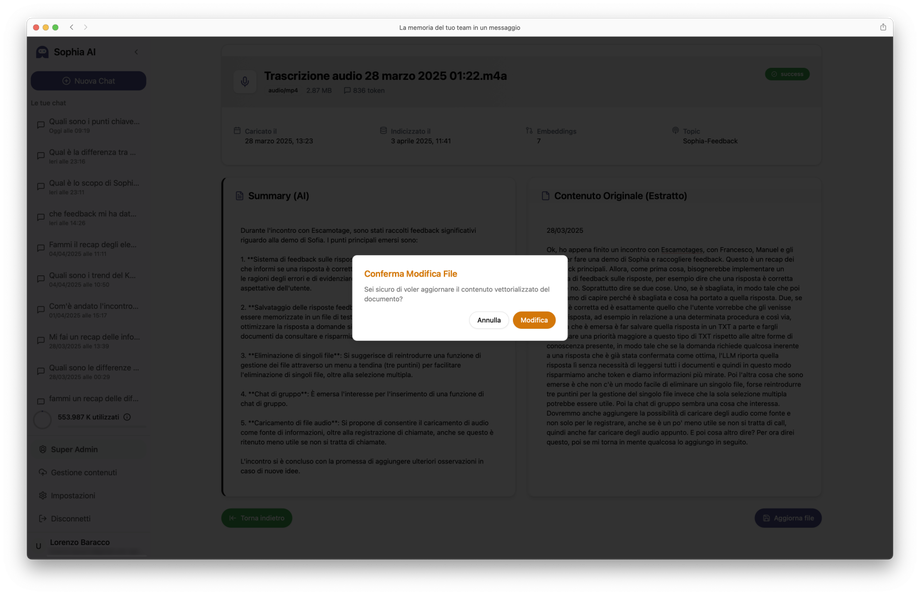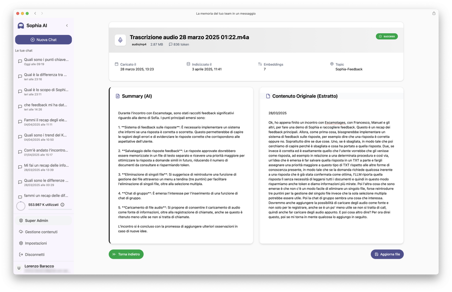 - Contenuto Originale (Estratto): si tratta del testo che l'AI ha estratto dal contenuto originale e che userà quindi per rispondere su in relazione a quelle informazioni; se il contenuto originario era un testo esso sarà riportato integralmente, se era un audio ci sarà la trascrizione completa, se era un documento (PDF, Word, Excel, PowerPoint ecc.) sarà mostrato tutto il testo estratto
