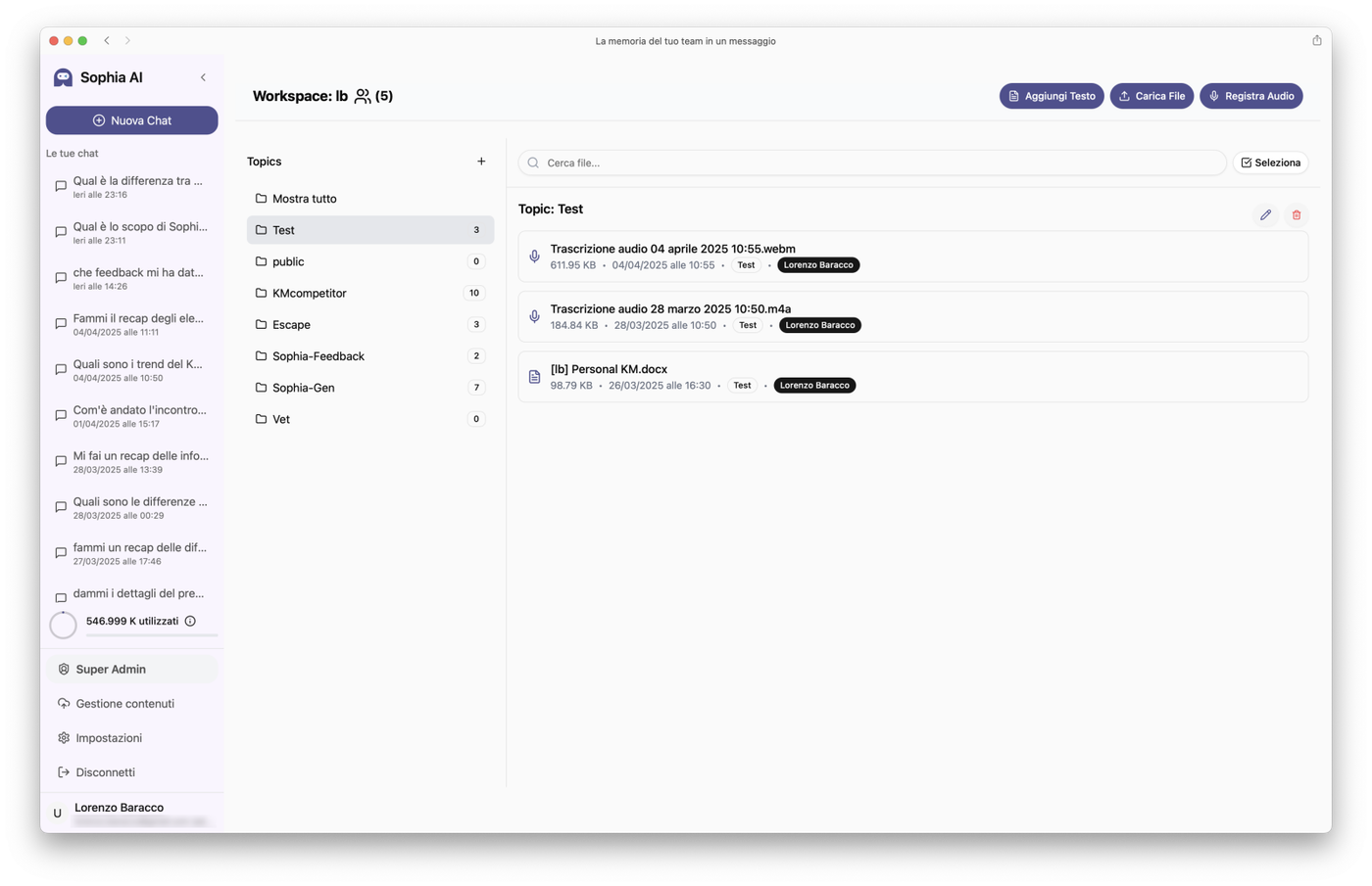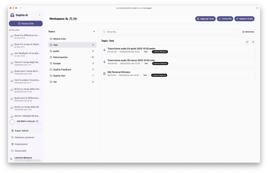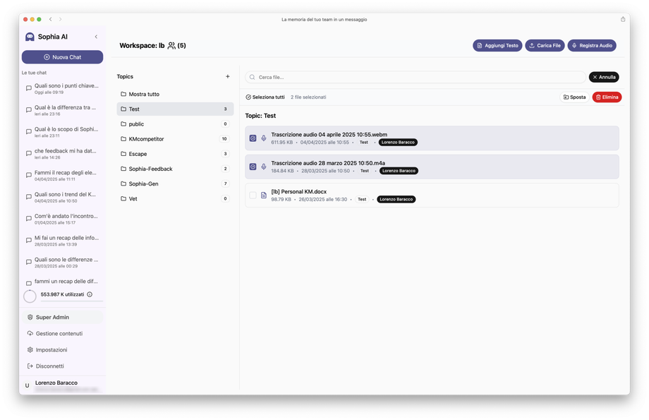 Una volta che hai aggiunto dei contenuti in Sophia (di qualunque genere, testo, file o registrazione audio), puoi gestirli selezionandoli dall'apposito pulsante "Seleziona" (in alto a destra) per assegnare loro un Topic differente o eliminarli del tutto.