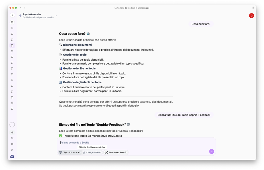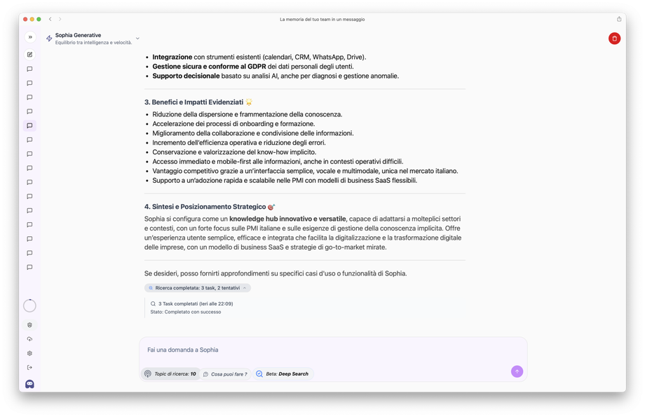 Abilitando la funzione Deep Search, Sophia effettua una ricerca avanzata in più step (verificando i risultati, ragionando su di essi e approfondendo la ricerca finché necessario) che permette di migliorare significativamente i risultati in casi di ricerche complesse e su grandi quantità di informazioni.