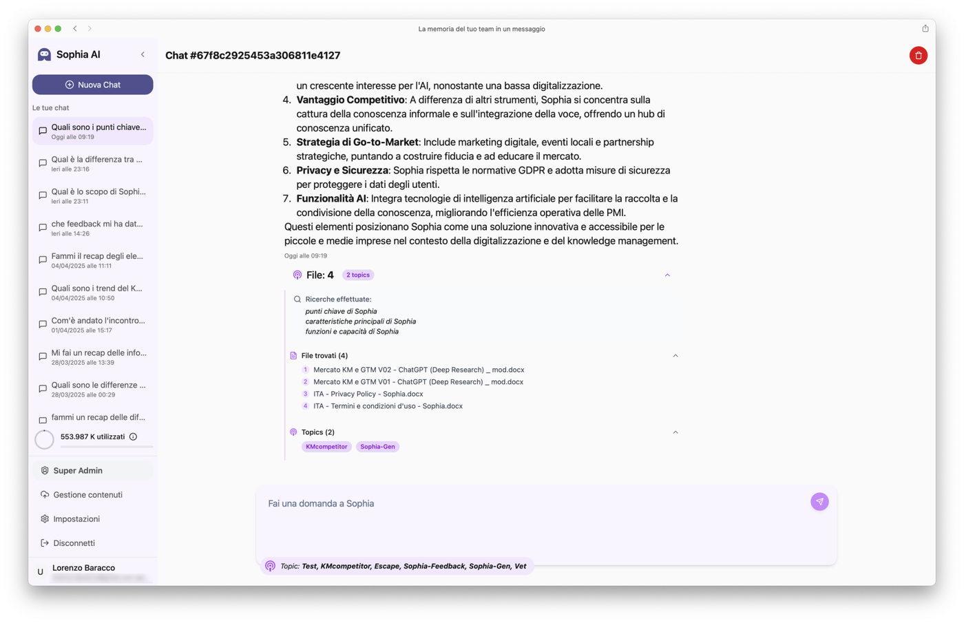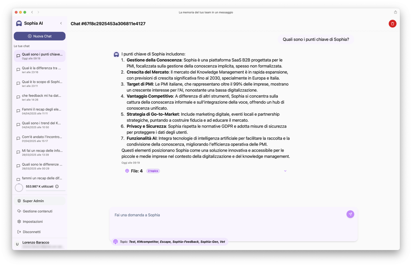 Per ottenere qualunque info contenuta in Sophia, basta iniziare una nuova chat e chiedere all'AI di Sophia: fagli semplicemente una domanda, esattamente come farebbe con un collega - che però sa tutto :)